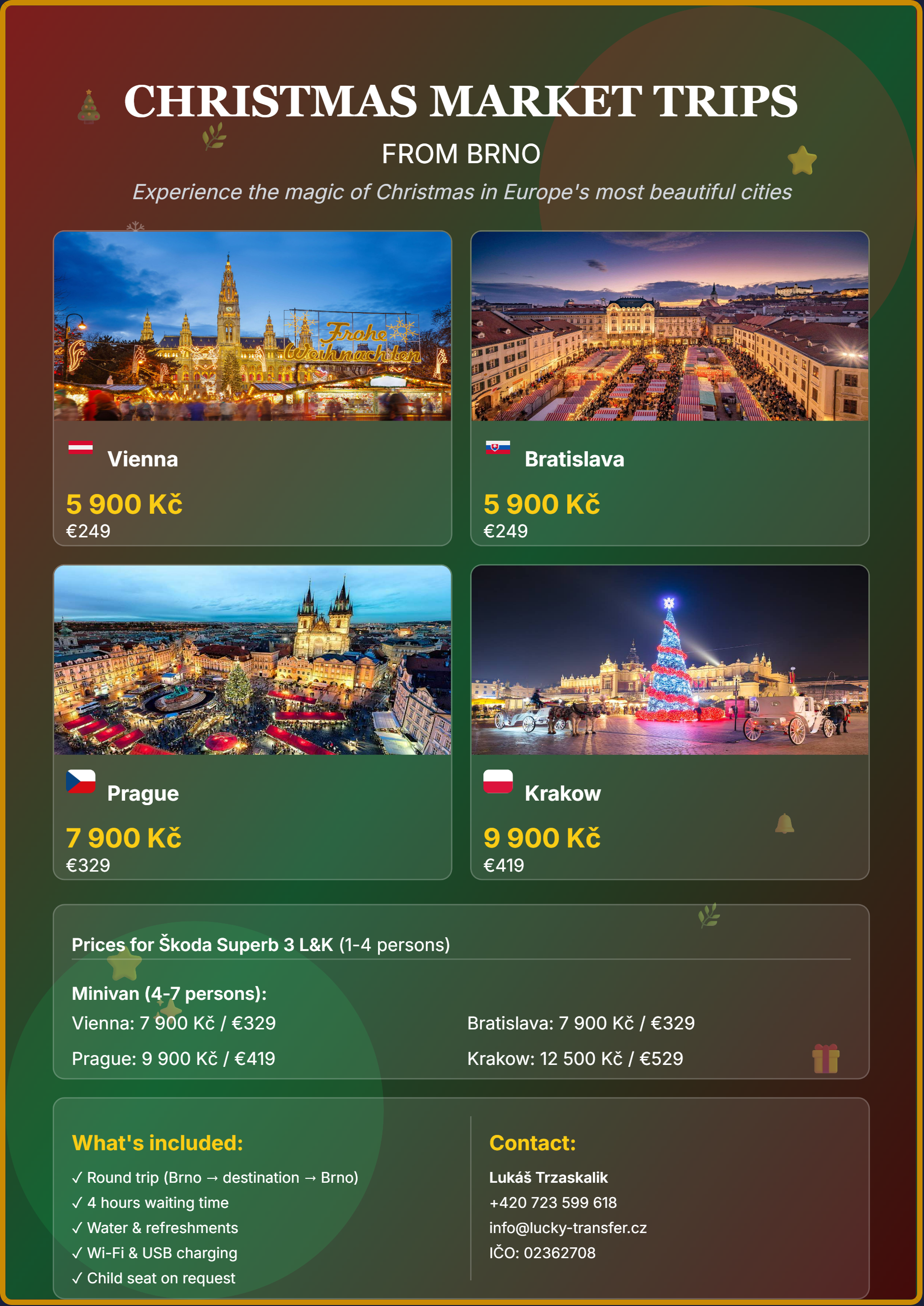 Book your trip at info@lucky-transfer.cz or call +420 723 599 618.