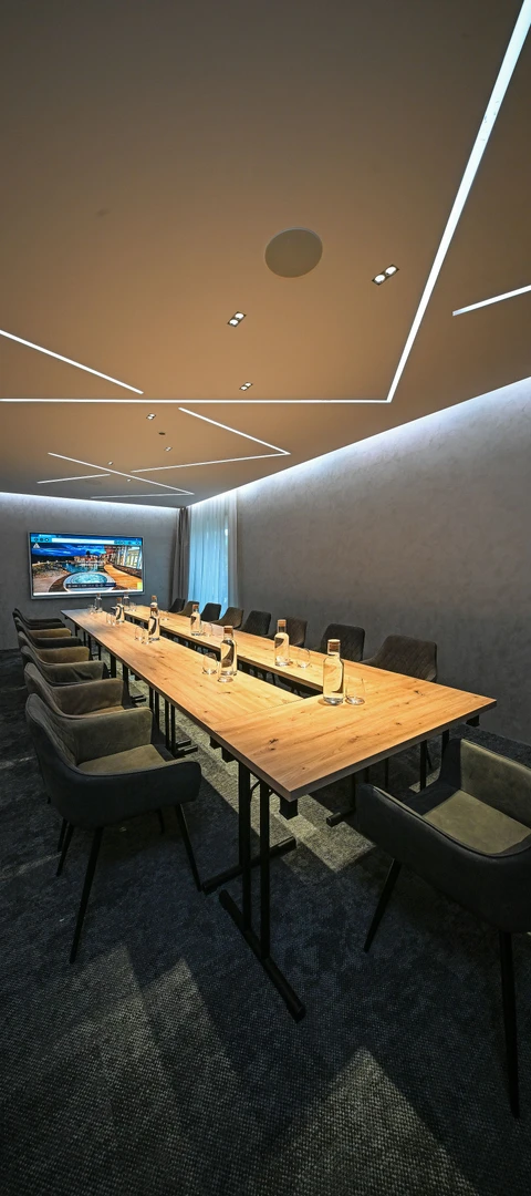 Zasedací místnost s moderním technickým vybavením. Nabízí klidné zázemí pro firemní jednání, zasedání a workshopy až pro 16 lidí.
